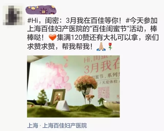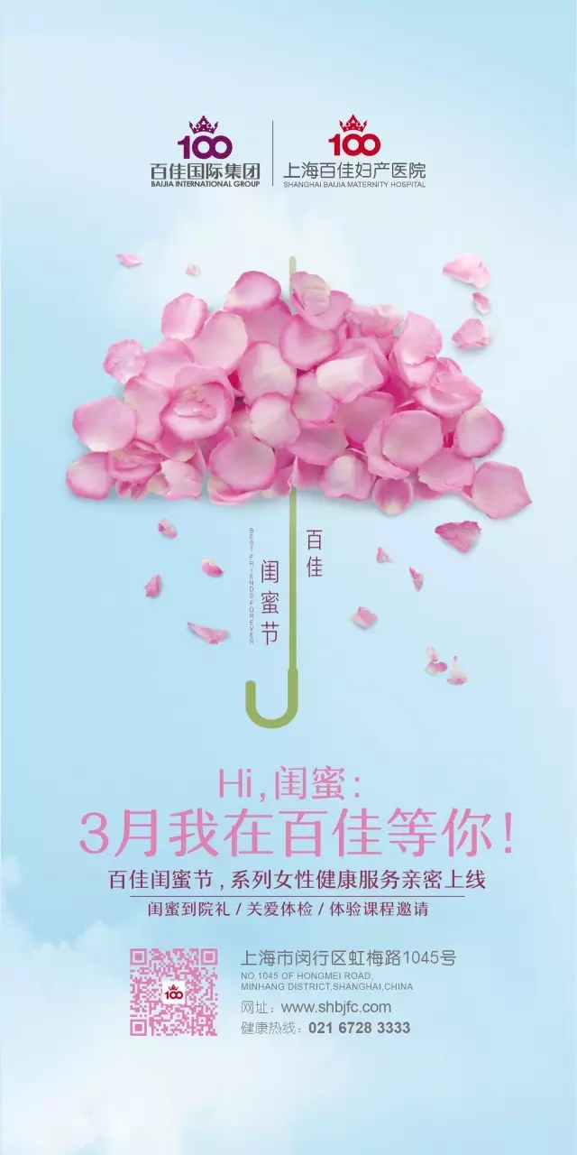 3月8日当天来院的小仙女们,还可参与百佳闺蜜节现场活动照片分享集赞赢大礼活动,将文字# Hi,闺蜜:3月我在百佳等你!#配现场活动照片分享至朋友圈,同时定位上海百佳妇产医院,集满120个赞,即可获得价值300元的礼品,数量有限,先到先得哟。
