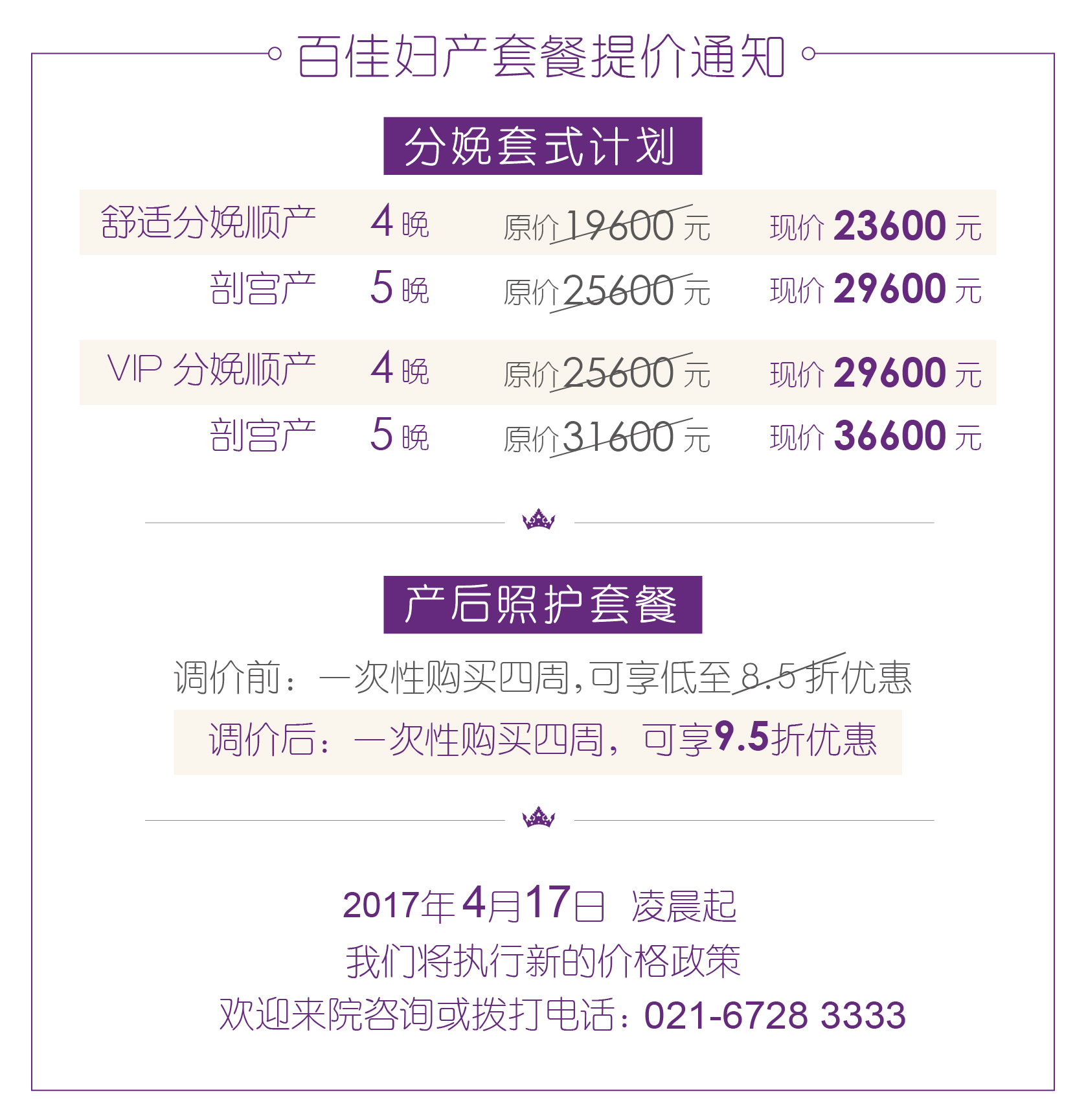 注意划重点了:4月17日前,来上海百佳妇产医院预定产后照护套餐和分娩套式计划可是最划算的,您只需要以4月17日前的价格,便可获得4月17日调价后更加尊宠的升级服务。花更少的钱,享受更加优质的服务内容与品质,想想都是美美哒!想了解详细情况,请拨打线上电话:021-6728 3333